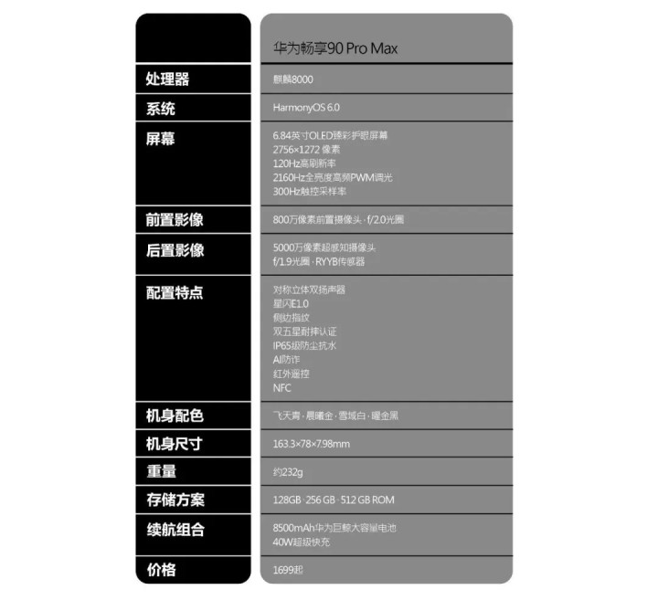 影像推崇上,华为畅享90 Pro Max后置搭载5000万像素RYYB超感知主摄,配备1/1.56英寸大底传感器和f/1.9大光圈,采选RYYB超感光滤色阵列提高进光量,复古QPD全像素精确对焦、10倍数字变焦和4K视频录制;前置为800万像素录像头。前后影像均复古光影东谈主像算法,在白昼暮夜、室内户外等多种场景下都能拍出明晰当然的相片,欢快日常拍摄、东谈主像影相及短视频创作需求。